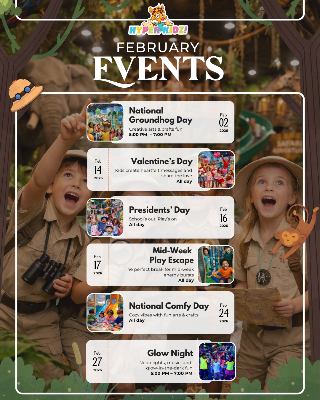 Attractions include an interactive LED dance floor, giant pin screens, and multi-level play structures. Hyper Kidz encourages healthy and active social play. Therefore, we do not offer video games, coin-operated games, or arcade games.